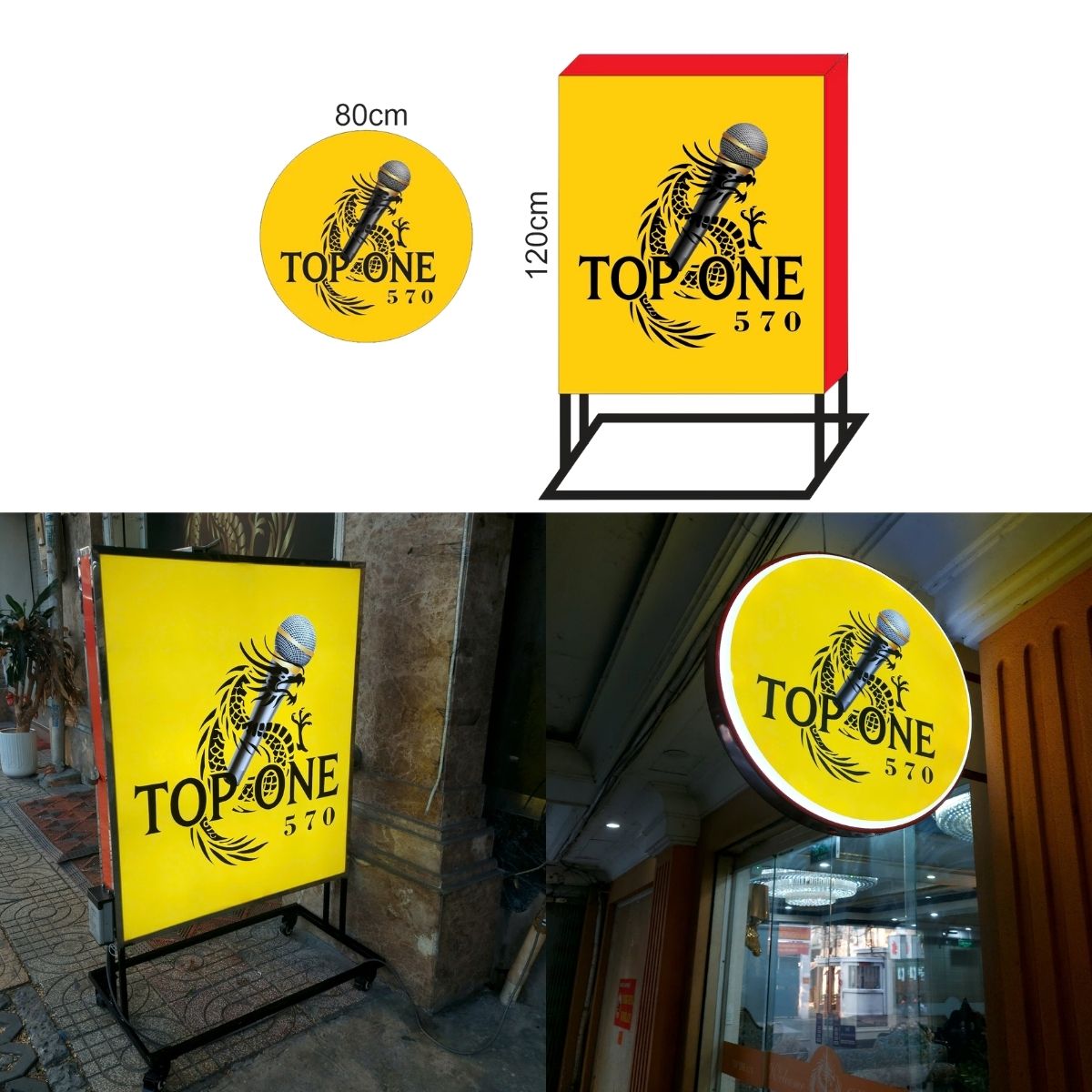 Combo bảng hiệu “hút khách” cho Karaoke Top One: Hộp đèn tròn 2 mặt nổi bật và biển hiệu đứng có bánh xe linh hoạt. Thiết kế tông vàng rực rỡ, đèn LED siêu sáng từ Duy An.